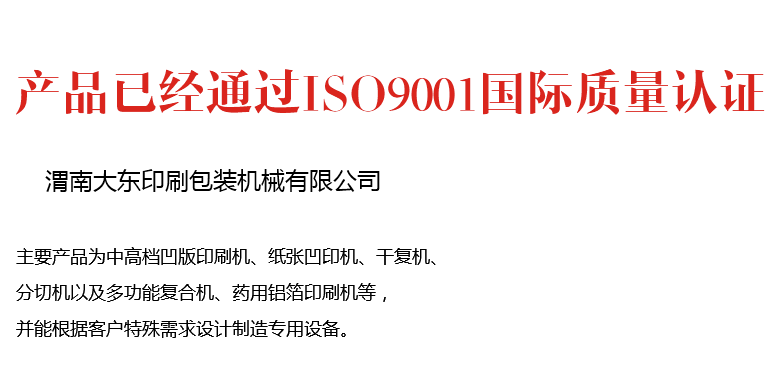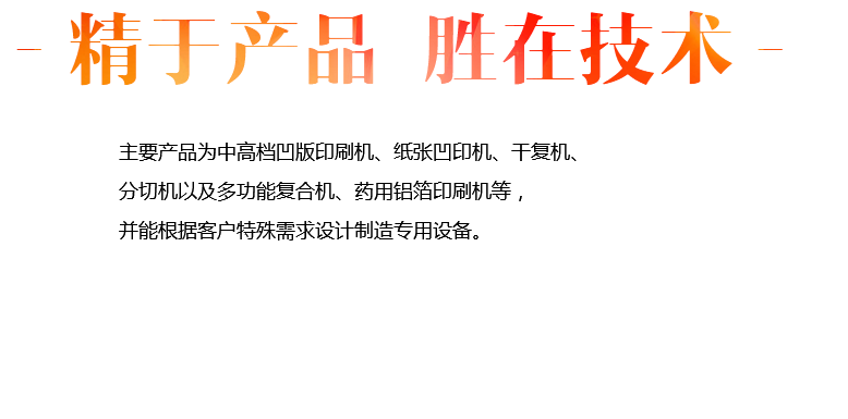 主要產品為中高檔凹版印刷機、紙張凹印(yìn)機、幹複機、分切(qiē)機以及多功能複合(hé)機、藥用鋁箔(bó)印刷機(jī)等,並能根據客戶特(tè)殊需求設計製造專用設備
