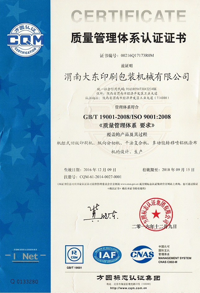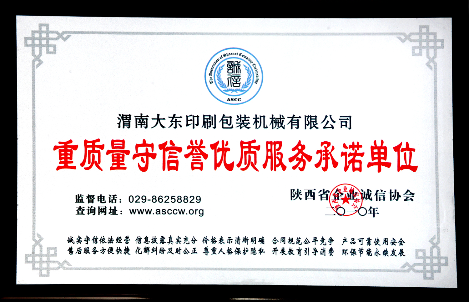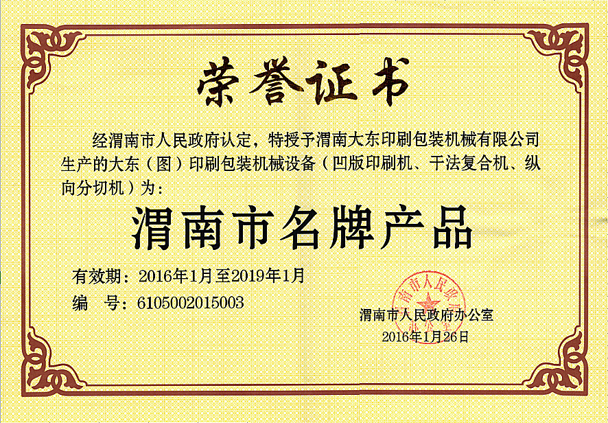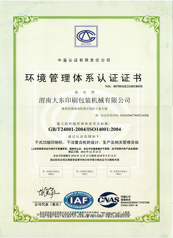 渭南草莓视频ios(dōng)印刷包裝機械有(yǒu)限公司成立於1991年,是一家專業研發及生產印刷包裝機械的裝備製造高新技術企業,其前身為渭南草莓视频ios(dōng)印刷包裝機械研(yán)究(jiū)所,2001年更名為渭南大(dà)東有限包裝機械有限公(gōng)司。企業通(tōng)過了ISO9000質量認證體係、ISO14000環境體係和"高新技術企業"認(rèn)證。