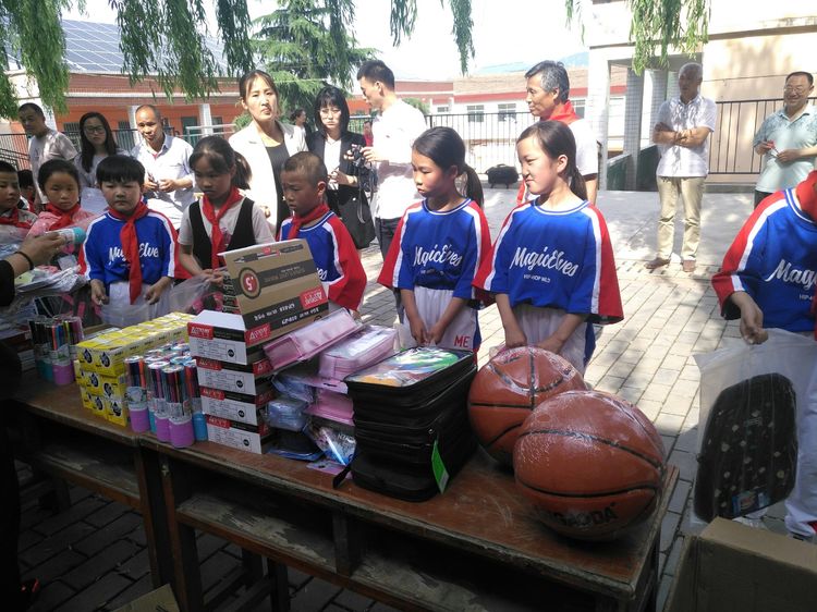 愛心人士們為貧困家庭學生及留守兒童送來書包、文具和體育器材等。